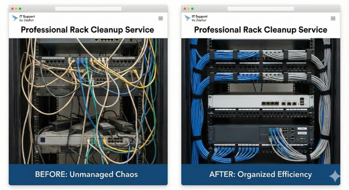 We provide expert IT support and professional rack cleanup services to transform cluttered network cabinets into organized, efficient infrastructure. Our service includes cable management, re-termination, labeling, patch panel alignment, and equipment reorganization to improve airflow, reliability, and troubleshooting speed. From offices to data centers, we reduce downtime, enhance performance, and deliver clean, well-documented racks that support scalability and ongoing IT operations.